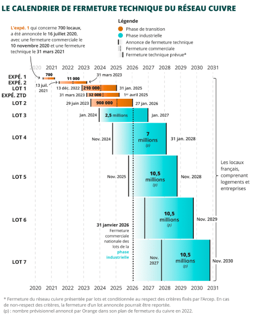En février 2025, environ 30 millions de lignes avaient déjà été fermées commercialement. À l’échelle nationale, Orange prévoit une fermeture commerciale d’envergure au 31 janvier 2026, couvrant une large partie du territoire métropolitain et ultra-marin. Cette opération se poursuivra dans un second temps, avec une fermeture complète prévue au 31 janvier 2027 sur le reste du territoire.