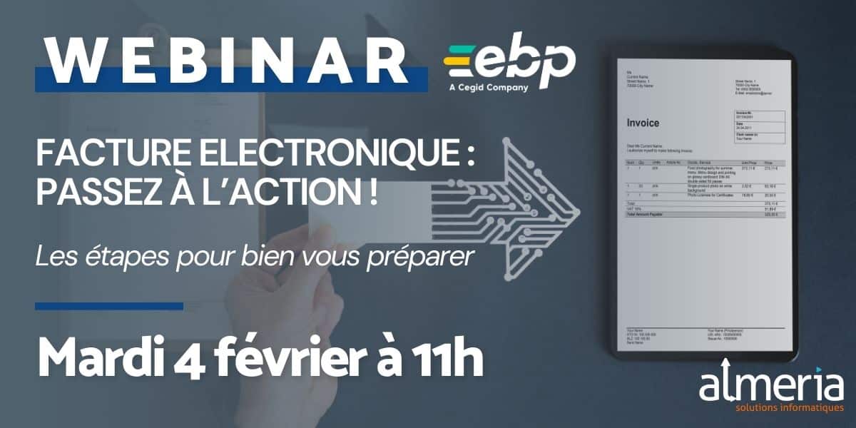 - Le mardi 4 Février de 11h à 12h : webinar Facture Electronique EBP animé par un expert EBP.